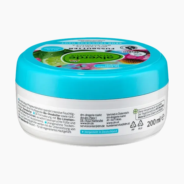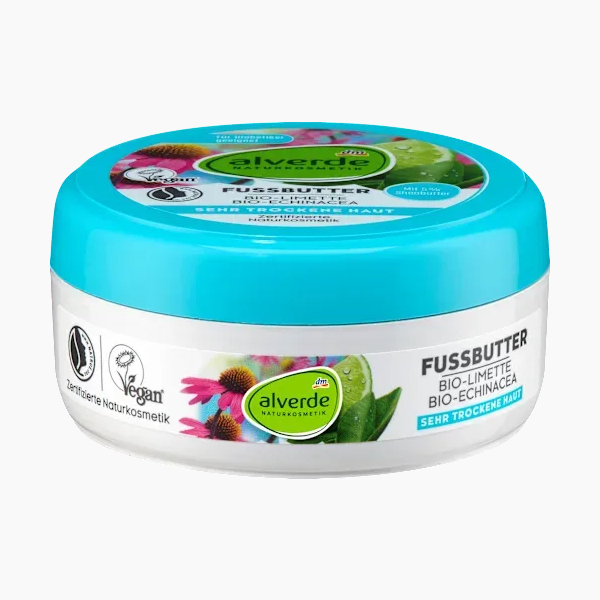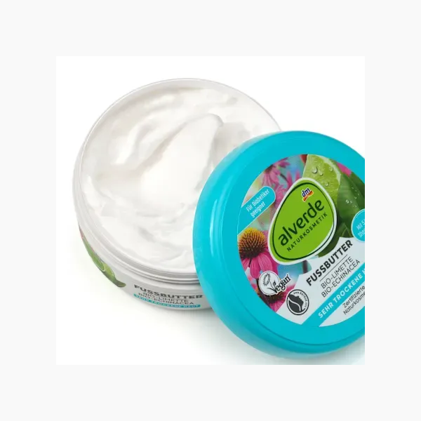 زبدة القدم بالليمون من ألفردي، مستحضرات التجميل الطبيعية، توفر عناية فائقة للبشرة شديدة الجفاف. تركيبتها الغنية تُدلل القدمين وتمنحهما نعومة فائقة. بفضل رائحتها المنعشة برائحة الليمون، فهي مناسبة أيضاً لمرضى السكري. خيار طبيعي لقدمين ناعمتين ومرتاحتين.
