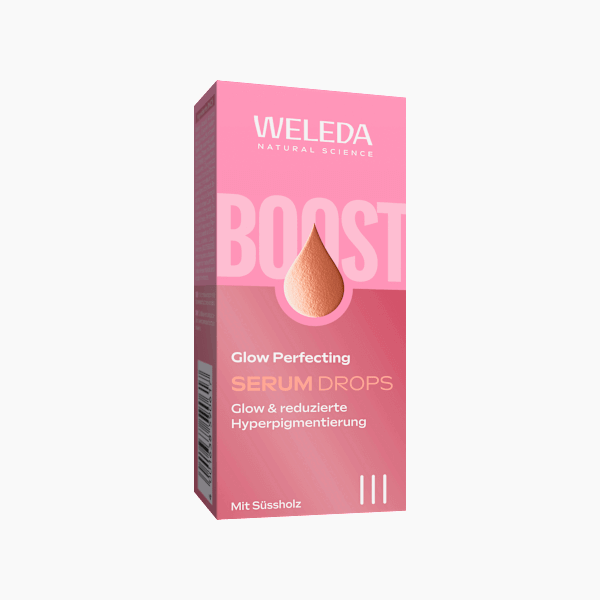 سيروم WELEDA Boost Drops Glow الغني بعرق السوس والأصباغ العاكسة للضوء يمنح البشرة إشراقة فورية ومظهرًا موحدًا.
