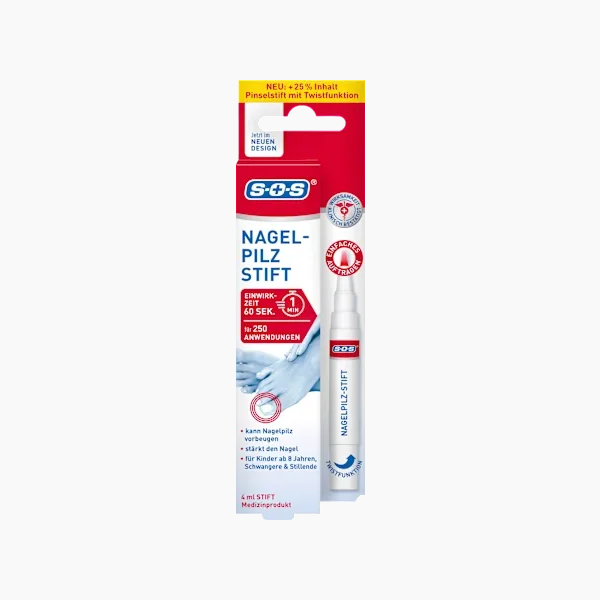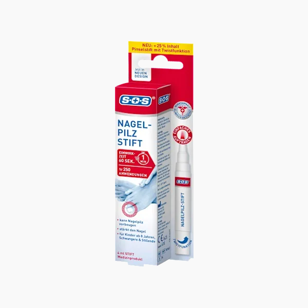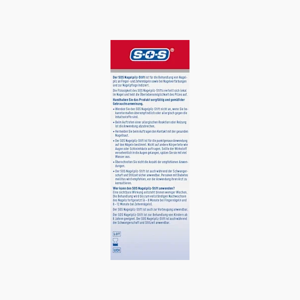 قلم إزالة فطريات الأظافر SOS يُستخدم لعلاج فطريات الأظافر في اليدين والقدمين. كما أنه مناسب للعناية بالأظافر، ويمكن استخدامه لتفتيح لونها. ينتشر السائل الموجود داخل القلم موضعياً داخل الظفر أثناء الاستخدام، مما يمنع الفطريات من النمو.