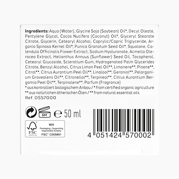 المكونات: ماء، زيت فول الصويا*، ديسيل أوليات، بنتيلين جليكول، زيت جوز الهند*، سترات ستيرات الجلسرين، جلسرين، كحول السيتريل، ثلاثي جليسريد الكابريليك/الكابريك، زيت نواة الأرجانيا سبينوزا*، زيت بذور الرمان*، سكوالين، مستخلص زهرة الآذريون، هيالورونات الصوديوم، مستخلص الأكميلا أوليراسيا، زيت بذور دوار الشمس، توكوفيرول، سيتيريل غلوكوزيد، صمغ السكليروتيوم، جلسريدات النخيل المهدرجة سترات، كحول بنزيل، زيت قشر الليمون الحمضي**، ليمونين**، بينين**، سيترال**، زيت قشر النارنج**، لينالول**، جيرانيول**، زيت بيلارجونيوم جريفولينز**، سيترونيلول**، تيربينول**، زيت قشر النارنج البرغامي**، تيربينولين**، عطر (عطر) * من الزراعة العضوية المعتمدة ** من الزيوت العطرية الطبيعية