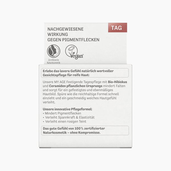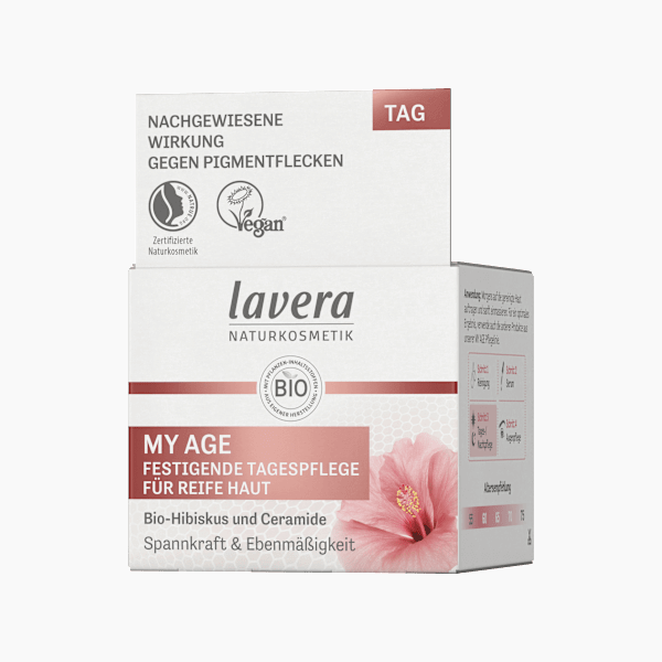 كريم لافيرا النهاري “ماي إيج” تركيبة طبيعية متوازنة بخلاصة الكركديه العضوي والسيراميدات النباتية. تركيبته الغنية سريعة الامتصاص، مما يمنح البشرة نعومةً ونضارةً، ويعزز تماسكها وتجانس لونها. كما يقلل التجاعيد وبقع التقدم في السن، ويحسن تماسك البشرة ومرونتها، ويمنحها إشراقةً ورديةً. مكوناته من مزارع عضوية معتمدة، وخالية من أي مواد بلاستيكية دقيقة سائلة أو مواد حافظة صناعية.