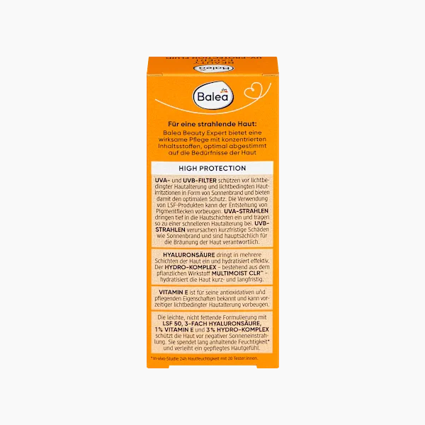 يحتوي على عامل حماية من الشمس 50، وحمض الهيالورونيك الثلاثي، ومركب مائي بنسبة 3% + فيتامين هـ بنسبة 1%. يحمي من أضرار أشعة الشمس الناتجة عن الأشعة فوق البنفسجية UVA و UVB. سائل فائق الخفة يمتص بسرعة. خالٍ من العطور. تركيبة خالية من الجزيئات البلاستيكية الدقيقة والبوليمرات الاصطناعية القابلة للذوبان في الماء. يوفر سائل الحماية من الأشعة فوق البنفسجية من باليا بيوتي إكسبرت عناية فعالة بمكونات مركزة، مصممة خصيصًا لتلبية احتياجات البشرة. تحمي فلاتر الأشعة فوق البنفسجية UVA وUVB من شيخوخة البشرة الناتجة عن الضوء وتهيجها، مثل حروق الشمس، مما يوفر حماية مثالية. يمكن أن يمنع استخدام منتجات عامل الحماية من الشمس (SPF) ظهور بقع الشيخوخة. تخترق أشعة UVA طبقات الجلد العميقة، مما يساهم في تسريع شيخوخة البشرة. تسبب أشعة UVB أضرارًا قصيرة المدى، مثل حروق الشمس، وهي المسؤولة بشكل أساسي عن اسمرار البشرة. يتغلغل حمض الهيالورونيك في عدة طبقات من الجلد ويرطبها بفعالية. يعمل المركب المائي – الذي يتكون من المكون النشط النباتي Multimist CLR™ – على ترطيب البشرة على المدى القصير والطويل. يُعرف فيتامين E بخصائصه المضادة للأكسدة والمغذية، ويمكن أن يساعد في منع شيخوخة البشرة المبكرة الناتجة عن الضوء. تحمي التركيبة الخفيفة وغير الدهنية، مع عامل حماية من الشمس SPF 50، وحمض الهيالورونيك الثلاثي، و1% فيتامين E، و3% مركب مائي، البشرة من التعرض الضار لأشعة الشمس. كما توفر ترطيبًا يدوم طويلًا* وتترك البشرة ناعمة ومغذية. *دراسة سريرية: ترطيب البشرة لمدة 24 ساعة مع 20 متطوعًا. تركيبة خالية من الجزيئات البلاستيكية الدقيقة والبوليمرات الاصطناعية القابلة للذوبان في الماء. درجة الحموضة: 7.1-7.8. المنتج متوافق مع دليل باليا للجمال النظيف –
