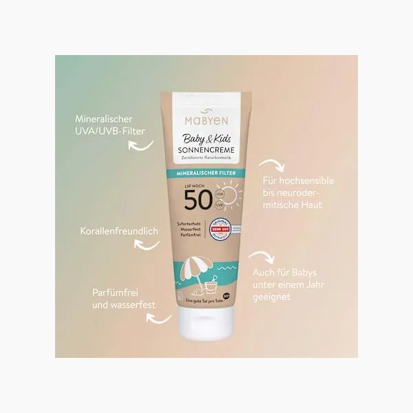• ميزات المنتج: مع عامل حماية من الشمس (SPF)، عناية بالبشرة الحساسة، درجة حموضة متعادلة، فلتر واقي من الشمس معدني، خالٍ من العطور، خالٍ من البارافين/الزيوت المعدنية، خالٍ من البارابين، خالٍ من الأصباغ، خالٍ من الكحول، مناسب بشكل خاص للأطفال، مستحضرات تجميل طبيعية